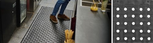 De Comfort Flow is een doorloopmat met uitstekende anti-vermoeidheidseigenschappen, speciaal ontwikkeld voor natte omgevingen waar vet, olie of chemicaliën aanwezig kunnen zijn. Dankzij het 100% nitrilrubber is de mat antislip, schokabsorberend en eenvoudig te reinigen. Ze is bovendien vaatwasmachinebestendig. Dit maakt ze bijzonder geschikt voor keukens en horecatoepassingen. De mat wordt vaak gebruikt in keukens en achter bars en kan na de shift eenvoudig worden opgeplooid en gereinigd. Ze is verkrijgbaar in 3 standaardmaten: 54 x 86 cm, 86 x 142 cm en 86 x 277 cm.