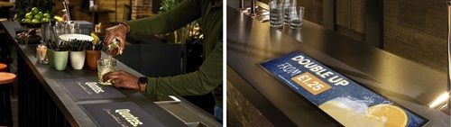 De bar- en countermatten zorgen voor maximale zichtbaarheid op de plaats van verkoop. Ze combineren een fotografische printkwaliteit met duurzame materialen. De bovenzijde bestaat uit 100% gebreid gerecycleerd polyester, terwijl de nitrilrubberen antislip onderlaag zorgt voor stabiliteit en veiligheid. Ze is verkrijgbaar in diverse standaardafmetingen.